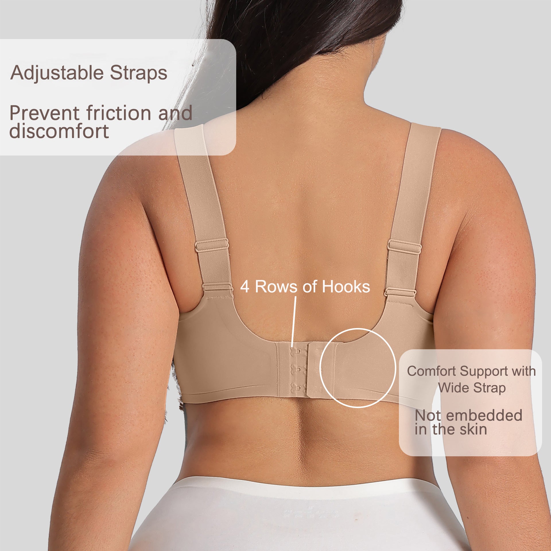 Wide Straps & Extended Back Buck: This bra features a widened shoulder strap design, which can provide you with strong support while reducing shoulder pressure. In addition, the 4-row back buckle can increase adjustment space, so that the bra can better adapt to your breast condition and waist changes.
